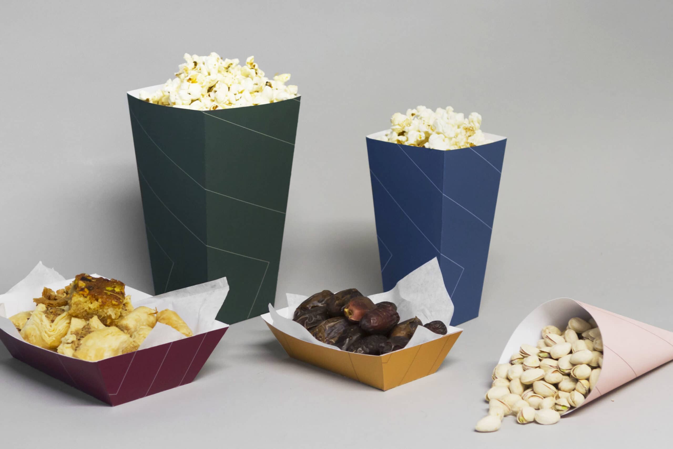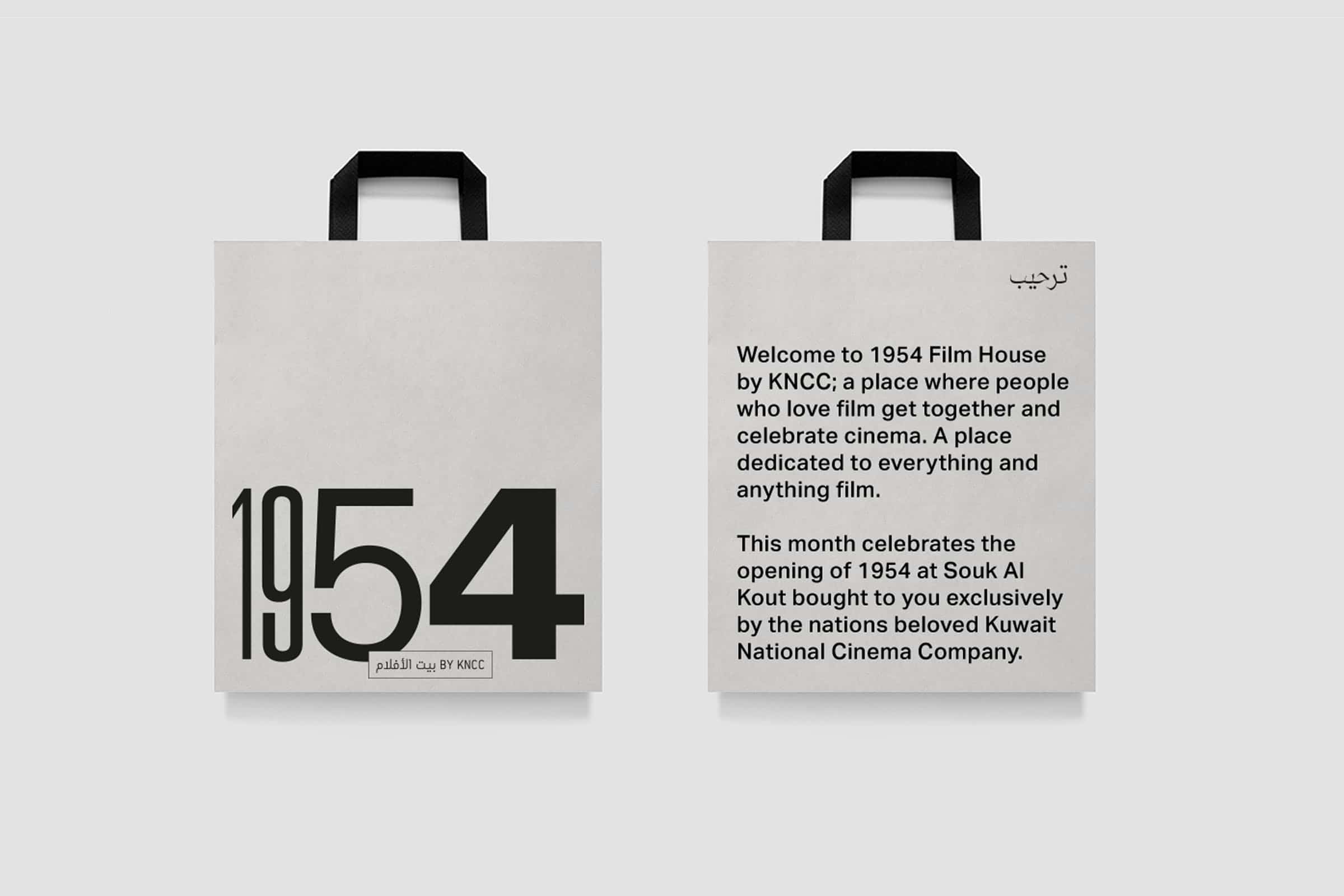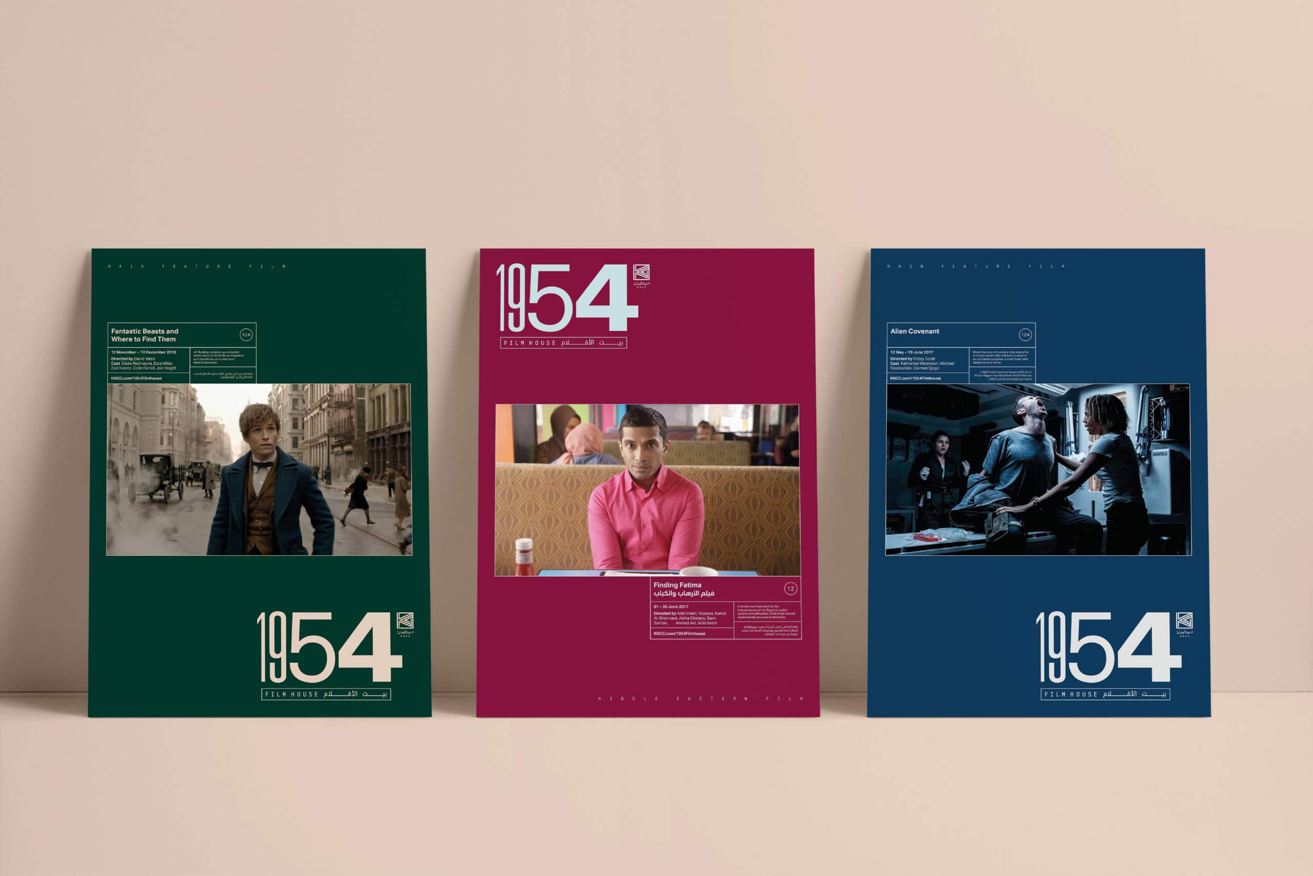 A trip through Kuwait's cinematic past uncovered numerous references; a local collector of movie posters became a goldmine of materials. Our wordmark and ticket-like graphics hint at the medium's past, present, and future.