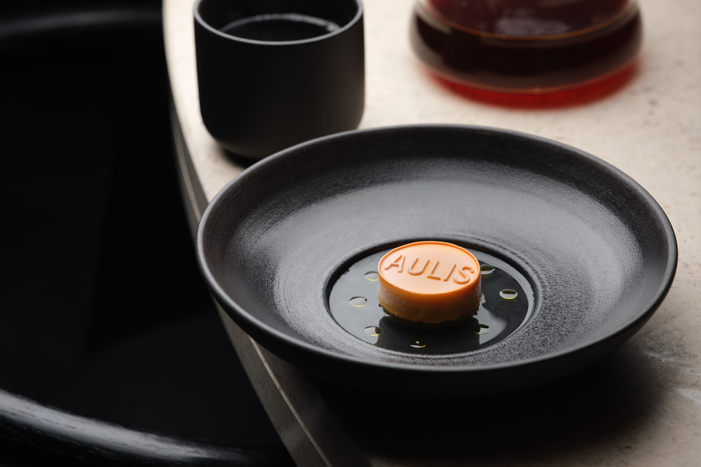 The mood is at once homely and inspirational. The dining area and adjoining lounge are a showcase for craftsmanship and natural materials. Amid the rich, warm, and earthy tones, diners encounter a variety of textures from the stone dining table to simple leather lounge seating. The leather is a renewable, wood-based material, while other fabrics are made from recycled and recyclable materials. Sustainability goes to the core of the Aulis concept.