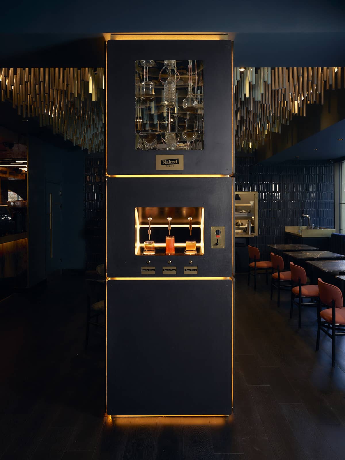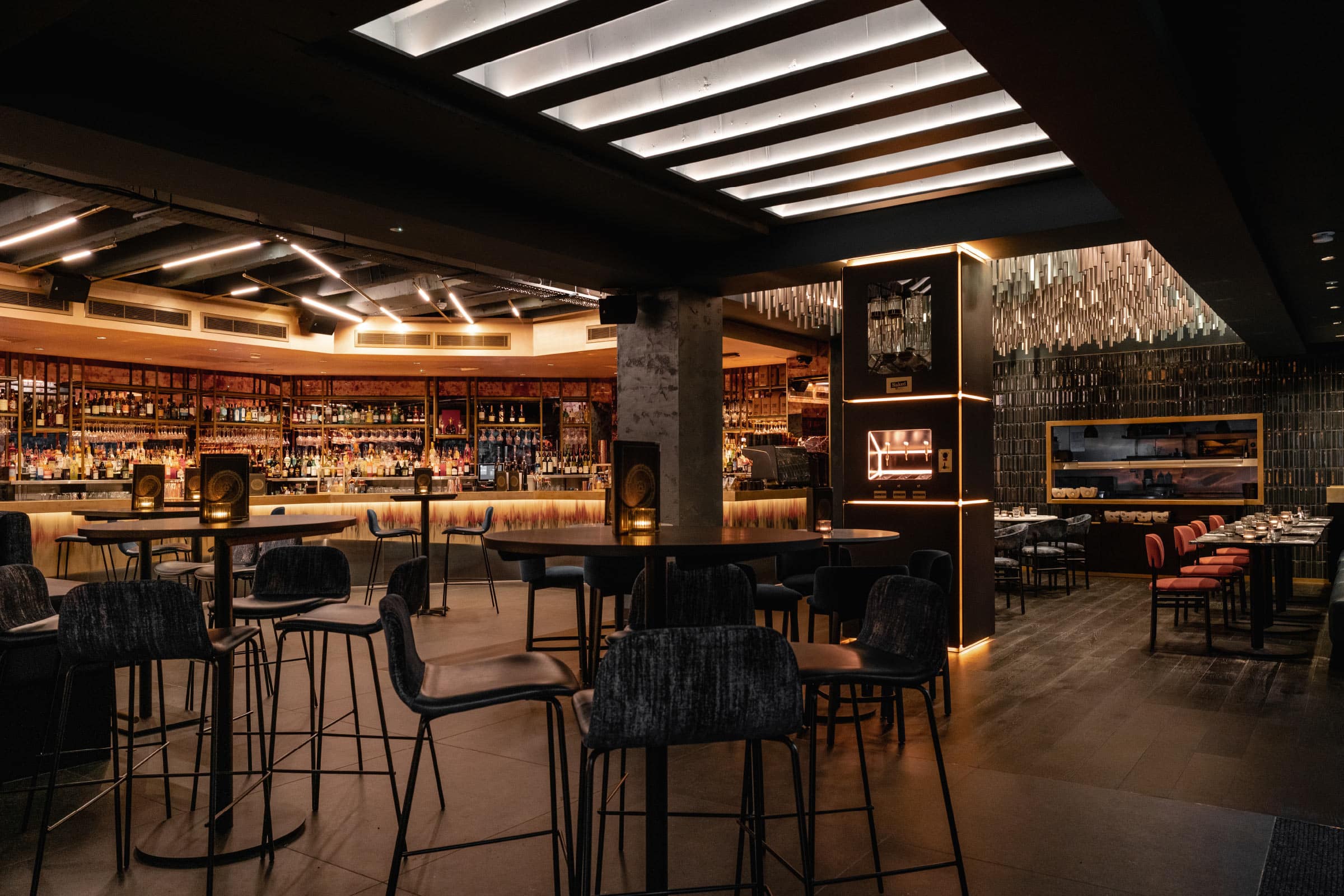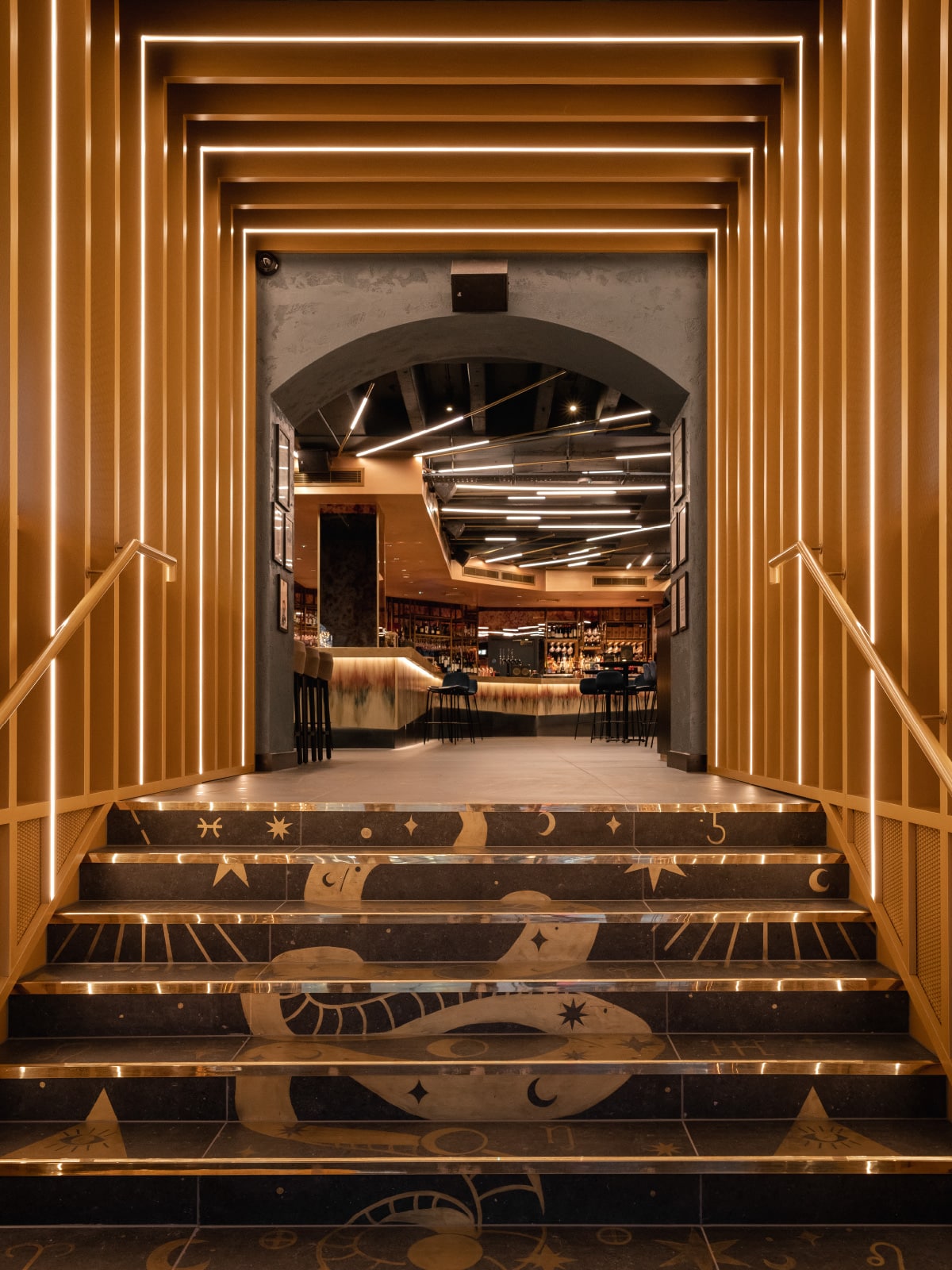 Our design lifts the brand clear of its steampunk origins into a new age of enlightened cosmic alchemy – into a multi-zoned, multi-sensory universe of discovery approached through a golden astrological portal. In this immersive and richly tactile cocktail playground, the statement bar radiates light and energy. The nearby Dispensary is an interactive self-serve bar that prepares and presents its cocktails with a theatrical puff of smoke. The future of cocktail service has arrived.