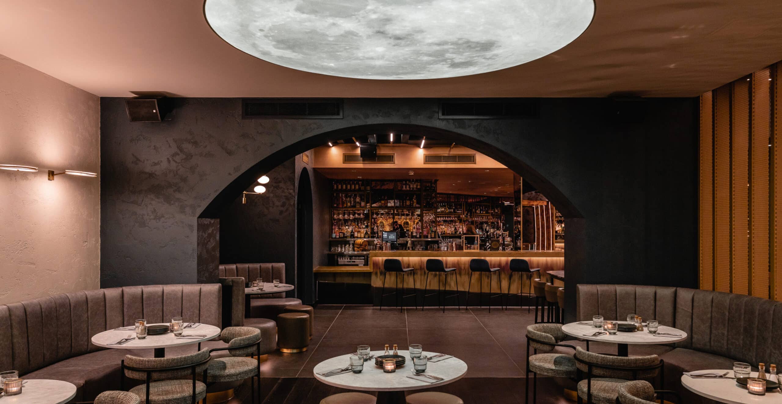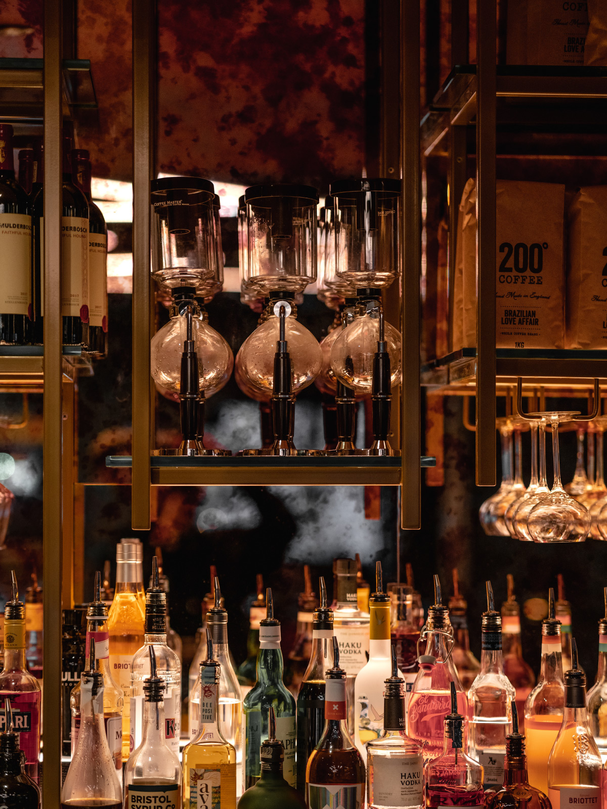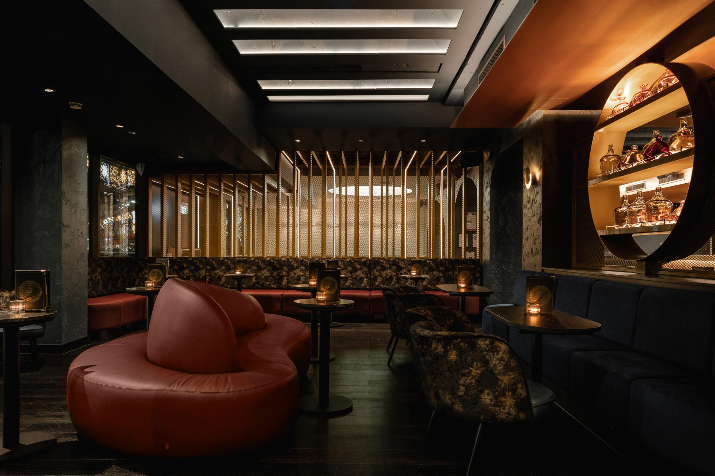 Our design lifts the brand clear of its steampunk origins into a new age of enlightened cosmic alchemy – into a multi-zoned, multi-sensory universe of discovery approached through a golden astrological portal. In this immersive and richly tactile cocktail playground, the statement bar radiates light and energy. The nearby Dispensary is an interactive self-serve bar that prepares and presents its cocktails with a theatrical puff of smoke. The future of cocktail service has arrived.