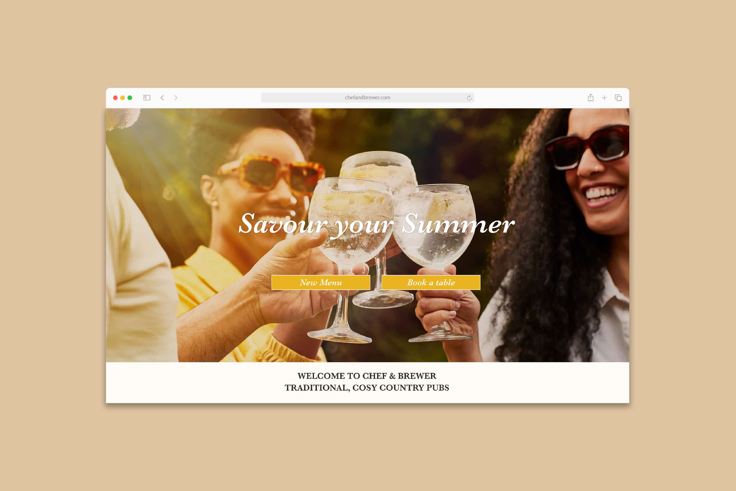 Our approach was wide-ranging. From the language, look, and feel of the menus to photography, web copy, and social media, we gave Chef & Brewer a warm and grounded, yet distinctive look. We portrayed the brand as the natural home of the warm pubby welcome. We gave it energy and relevance for a choosy audience looking for a great meal in relaxed surroundings. Our partnership with Chef & Brewer goes beyond and we work with them on a seasonal basis, bringing their campaigns to life from concept to delivery.
