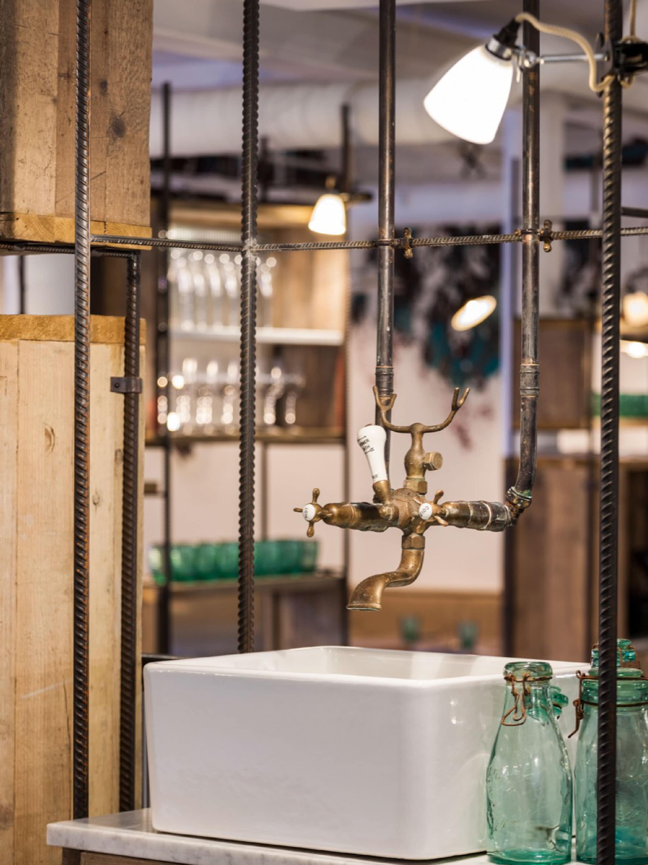 For us, the concept of 'human alchemy' (every raw material needs a human touch) became the vital industrial-to-human softening link. The result is comfortable, honest, colourful. Industrial elements such as reinforcing bars and scaffolding planks meet thickly upholstered cushions and floral armchairs. Feminine twists underpin the brand's homeliness.